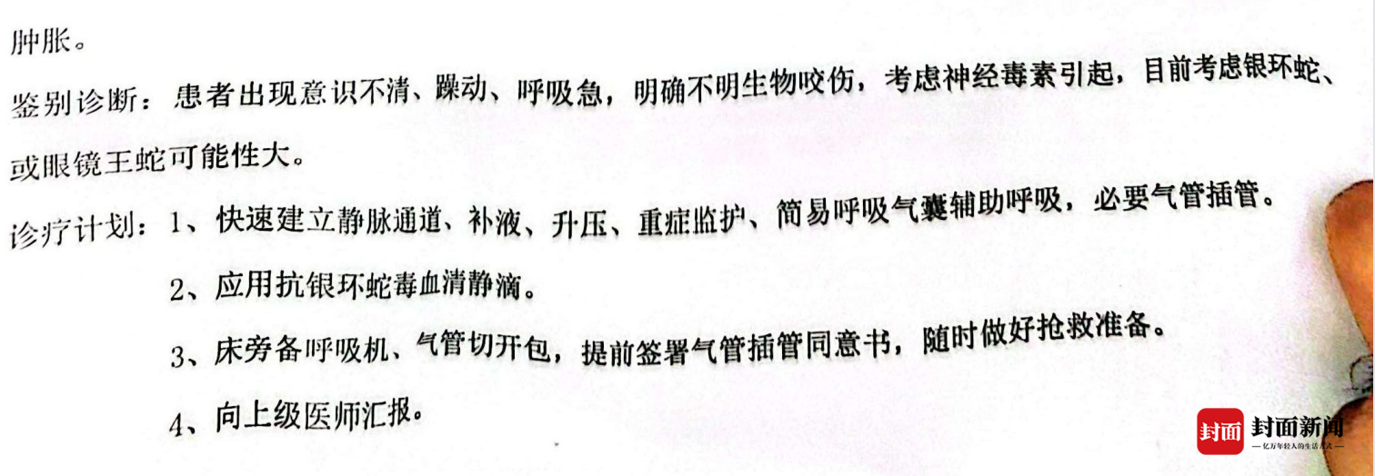 家属提供的就诊资料显示,死者转入第二家医院后,自述中“为不明生物咬伤,伤脚无肿胀,伤口肤色正常,伴随麻木、恶心呕吐”,入院时呼叫不应,躁动,呼吸急促、音重,初诊被怀疑银环蛇或眼镜王蛇咬伤,使用了抗银环蛇毒血清治疗。入院抢救一小时后自主心跳、呼吸未恢复,心电图持续直线状态,抢救两个半小时后判断临床死亡。